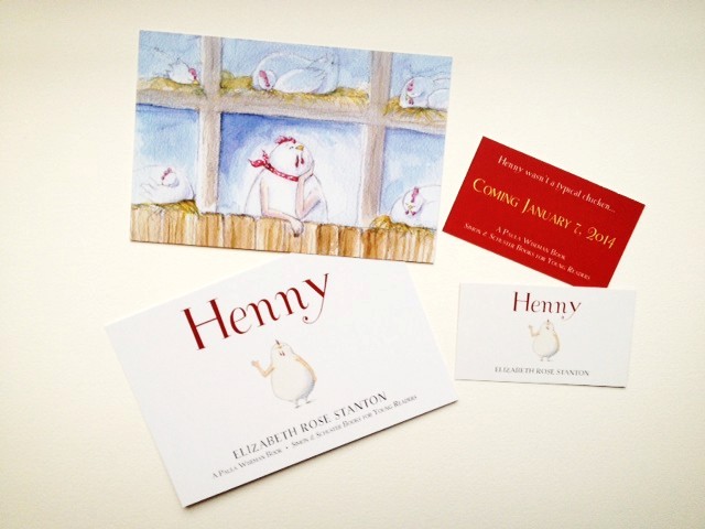I had three sets of cards made: one sporting the cover and a spread from HENNY-- same image that's in the SCBWI Illustrator Exhibit (postcard size), and the other heralding the launch date for the book (business card size). Then I had a set of five alternating layouts made up for my business cards. SO glad they're done! What do you think?