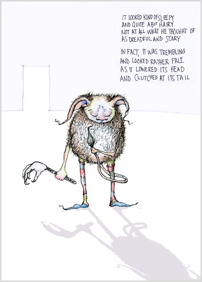 Am posting a concept sketch from a page of a picture book I am working on, since there's a little bit of shadow drama going on.  The story is in verse, and deals with the classic "there's something-under-the-bed" dilemma that all kids face at one time or another [I still worry about it sometimes ;) ]. The Thing has just lumbered out from under the bed, at the brave insistence of the little hero of the story... Hopefully the book will eventually be published, so you can find out what happens next :)