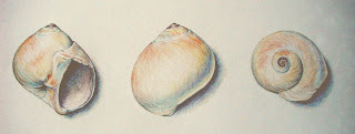 | Moon Snail Shell (three views) wax pencil on coquille board |